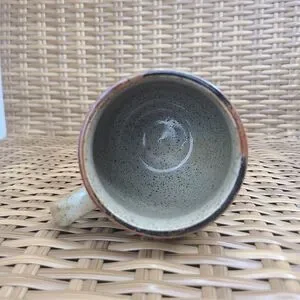 Ceramic hand thrown coffee tea mug cup with handle. Gray, green, brown in color.