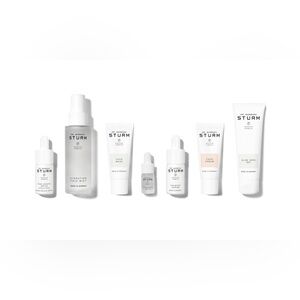 • The entire 7-step skincare routine comes in a reusable, yellow neoprene bag, which is part of Dr. Sturm's migration to sustainable packaging and features