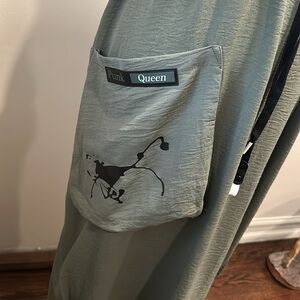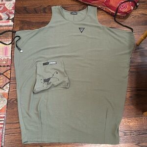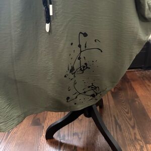 Worn once interesting sleeveless dress can be worn multiple ways tied in the back tied in the front left loose abstract painting on pocket and back chest meas 23 flat