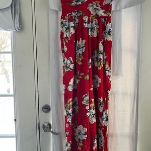 Stunning red maxi dress with eye-catching floral design. Perfect for any event.