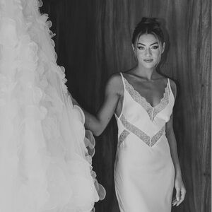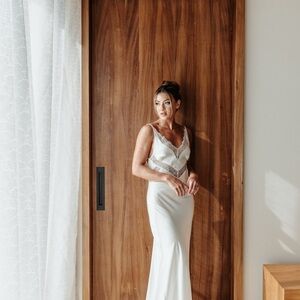 I wore this dress for an hour prior to putting on my wedding dress. This dress was only bought for pictures so no flaws or stains and has been dry cleaned.