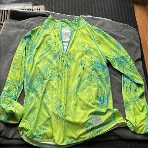 Vibrant green shirt with blue details. Perfect for outdoor activities like fishing, kayaking, hiking, in good condition