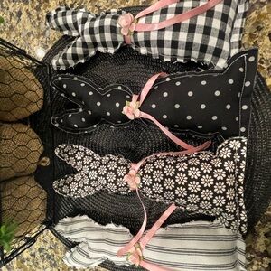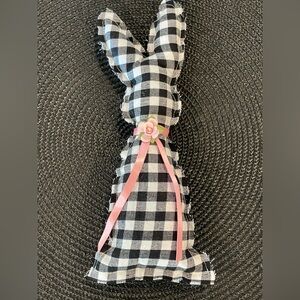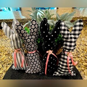 New Hand Crafted Primitive Easter Bunnies. Set of 4. Size: 10” x 3 “. Black, white and gray in color. Great for baskets or table decor.