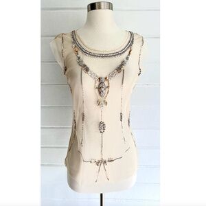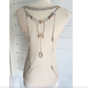 Very sheer top beautifully embellished with jewels and sequins. Tags have been removed. Gently pre-owned with no flaws or issues!