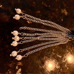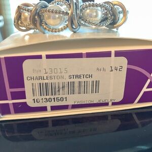 Gorgeous chunky Lia Sophia matching set. Silver tone. Bracelet is stretchy and can stretch up to twice its size. Necklace approx 26” with extra 3” extension. See photos for size. [One of the dangles on the necklace is missing its bottom bead. Not noticeable when wearing]
