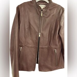 Reiss Eggplant Leather Waist Length Coat. Zipper side pockets and front zipper that zips from bottom as well.