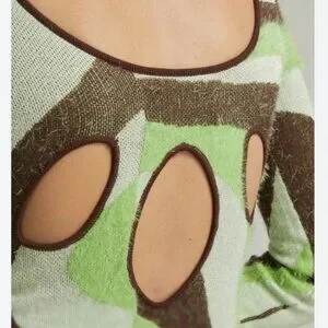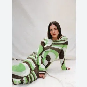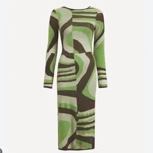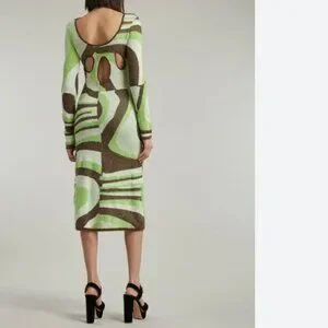 House of Sunny’s signature ’70s groove-inflected style. A long-sleeved twist on the iconic Hockney Dress, the Land Cruise Hockney has a round neckline, form-fitting, slip-like silhouette and midi length. Its knitted from a vegan yarn - a HOS classic. The fabric is distinguished by a green and chocolate toned wavy print that alternates between a smooth and fluffy touch, much like jacquard. Captivating oval cut-outs at the back add a touch of drama.