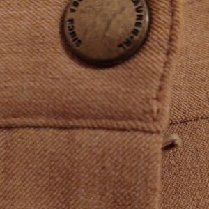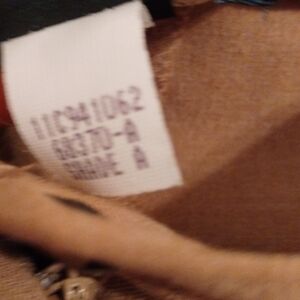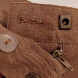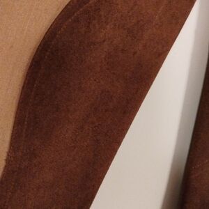 Zip up with silver metal flat hook and clasp. Chocolate brown Patches. Cuffed hem. Some Stretch. Pig Suede.