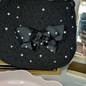 Classic Evan Picone with this lovely bag. It has a macrame feel and has lovely pearl beads all over including the handle. Lovely bow on top with more pearl beads . Snaps shut on top.