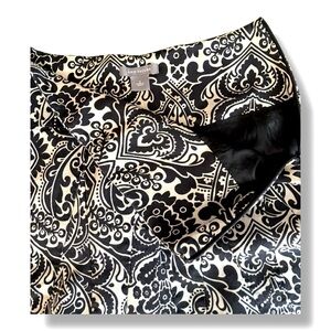 This elegant skirt features a classic black and white paisley design, perfect for any occasion. Its timeless pattern adds a touch of sophistication to your wardrobe. Half zipper on side. Lined.