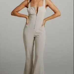 Showpo Georgianna Flare Contrast Stitch Detail Jumpsuit in Beige - Size 8