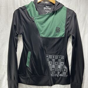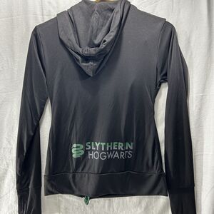 This is a Harry Potter-themed hoodie in size XS, featuring the Slytherin house design. It is designed for women and suitable for activewear. The hoodie is a stylish way for fans of the Harry Potter series, particularly those who identify with the Slytherin house, to show their allegiance and stay cozy during workouts or casual outings.