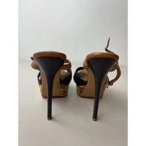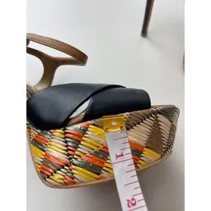 👡 Description: Elevate your style with these boho-chic platform heels, featuring black leather crisscross straps, tan ankle buckles, and a vibrant multicolor woven platform base. The stiletto heel measures approx. 5 inches, with a 1.5-inch platform.