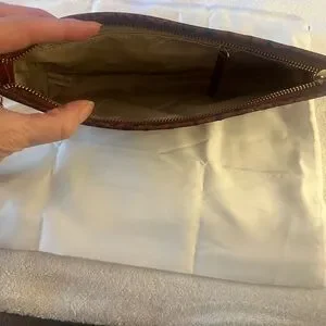 A removable strap makes this your most versatile small accessory. With a zipper across the top, carry as a wallet inside a larger handbag by day, then carry as a clutch or wristlet come evening. Featured in Pecan Melbourne/ signature croc-embossed leather in a wear-with-everything brown. Genuine leather. Zip top Removable wristlet strap, Interior zip pocket. 6.25" wristlet strap. Comes with dust bag. Cute tassel feature.