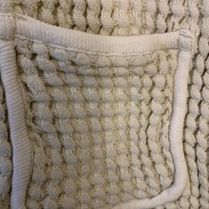 Stay cozy and stylish with this cream snap-up 100% cotton cardigan. Perfect for layering, this jacket offers both comfort and style. Has a raw cotton look. Missing part of top snap as shown, but is not noticeable.