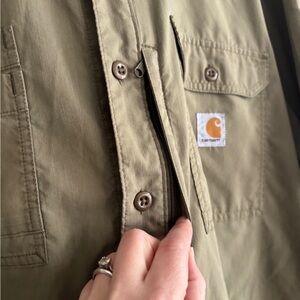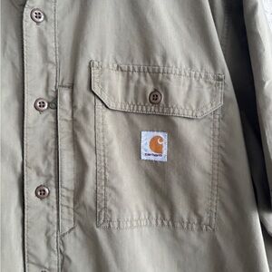 Carhartt Men's Button Front Tan Vented Shirt Short Sleeve 2XL. Good condition with minor wear there are no stains tears or holes. See photos for measurements.