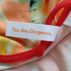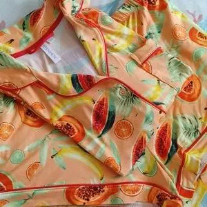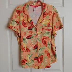 Joyspun "Peach Blossom" notch collar shortie pajama set. Background color is peach, with yellow, red & green.