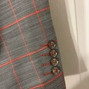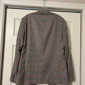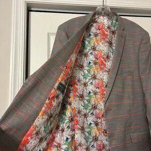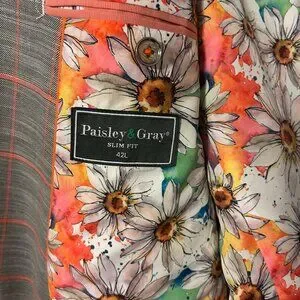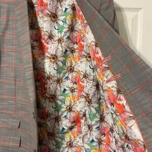 Details: Gray and Peach Plaid with Gorgeous Multi-Color Floral Lining. Two (2) Button Closure; Collar and Long Sleeves. Buttons on each Sleeve End. Three (3) Pockets on Front, in Addition to a Chest Pocket. Fully Lined. Three (3) Inside Pockets. Two (2) Walking Pleats on Back for Ease of Movement.