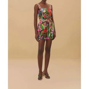 Crafted from viscose, this multicolor romper features a striking floral print and a flattering self-tie waist. With a charming square neckline and delicate straps, it offers a playful, carefree style. Button closure. Machine wash and lay flat to dry.