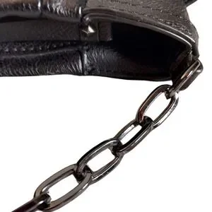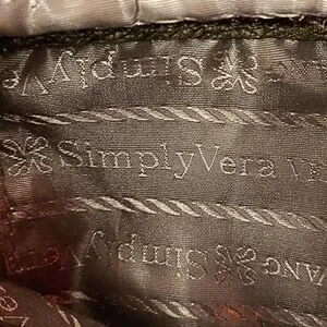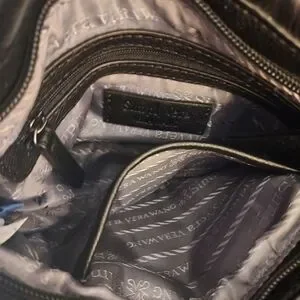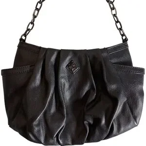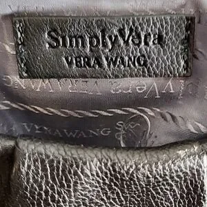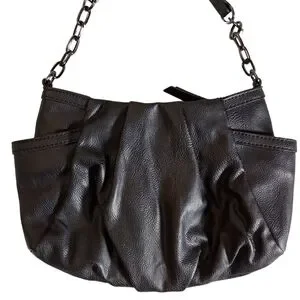 Vintage SimplyVera Vera Wang black crossbody purse featuring water-resistant vegan leather, side pockets, zippered inner compartment and open pocket, chain strap detail, and scrunch style that can be dressed up or down