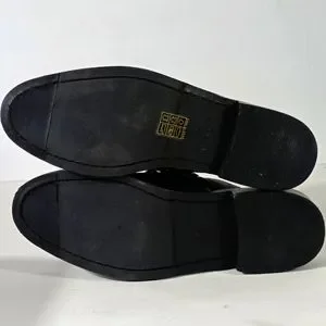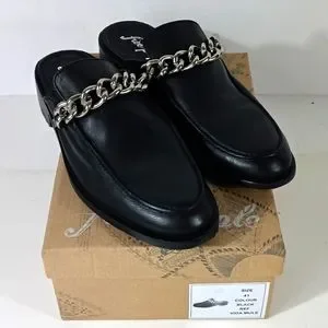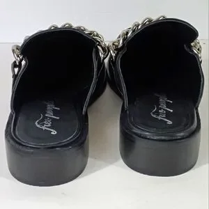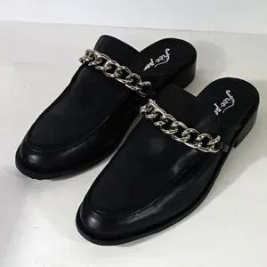 Sleek black mules with a bold silver chain detail. Comfortable slip-on design. Perfect for casual or dressy occasions.