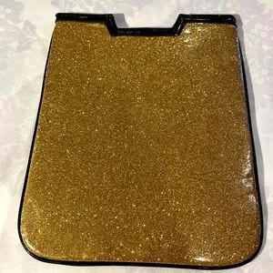 Put your iPad/tablet to bed in this glamorous Betsey Johnson sleeve. It measures 8" x 10". It's golden glitter on both sides, but covered in plastic so all that shimmering stuff stays where it should. Check out the fine black patent trim all the way around the perimeter and Betsey's signature lining inside.