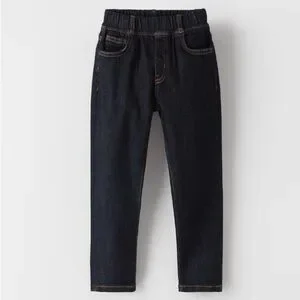 Stylish dark denim jeans for kids. Features an elastic waistband. Perfect for casual wear.