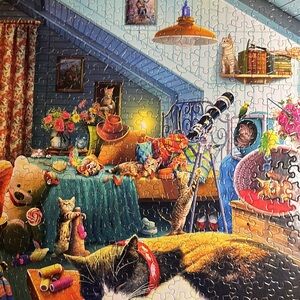 Contains 550 pieces and features a charming scene of playful kittens in an attic setting