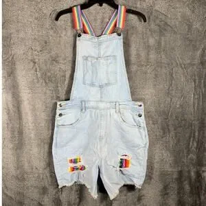 Overall Shorts Womens Medium Blue Denim Jeans Rainbow Details Festival Casual