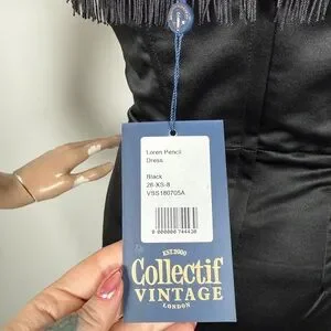 This is a super gorgeous little black Loren dress pencil dress from Collectif clothing. It’s a lovely stretch satin with black fringe trim. Bodice is boned for structure. Non slip rubber strip sewn into the bust. New with tags.
