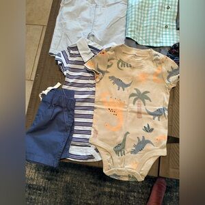 1 blue striped shirt with matching shorts and a matching Dino onesie.