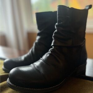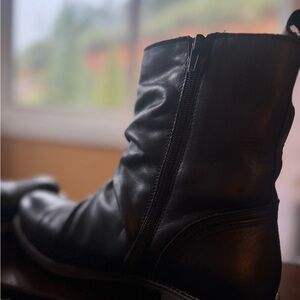 These black ankle boots feature a durable rubber sole and a soft matte leather finish, offering both style and comfort. The slouchy shaft adds a relaxed touch, making them perfect for casual outings. With a simple monochromatic design, these boots are a versatile addition to any wardrobe.