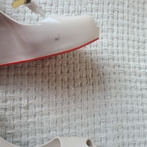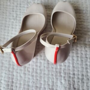 PATCHULI X BY MELISSA PLATFORM WEDGES Women's Size 6. Preowned. Minor wear. Some marks. Please see pictures. Platform wedge design. Platform construction. Soft rubber heel. Peep toe front. Solid scarlet sole and accent line down back of heel. Ankle strap with buckle closing. Heel Measurements In Pictures. Good Condition. Smoke Free Home. Offers Welcome.