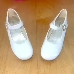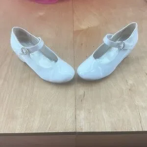 Preloved good condition some scuffs haven’t cleaned white patent dress shoe pageant shoe girls size 1 with bling accent