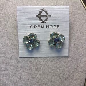 These exquisite earrings by Loren Hope feature a unique clover-like design, showcasing four cushion-cut green gemstones with a lighter blue center stone. New with tags.