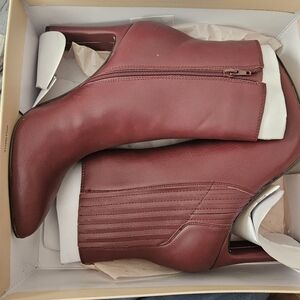 BCBG womens boots, brand new in box, never worn. great with dresses & skirts, jeans and jacket, really versatile. 4 inch heel too high for me, theyre calling the color merlot, like a wine or burgundy. smoke free, pet free home