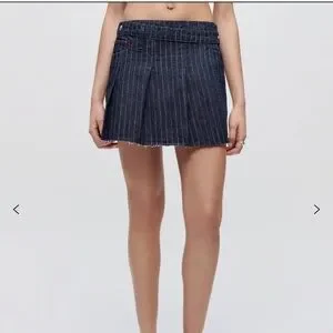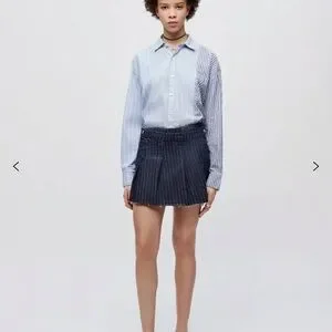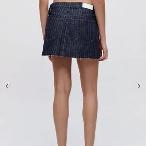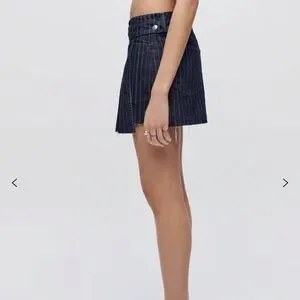 The Tennis Wrap Skirt in Indigo Pin is flirty update to athletic sport skirt. Constructed from luxe Japanese pinstriped denim, this style features pleats, a snap closure, and cut off hem.