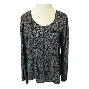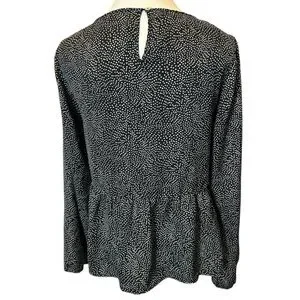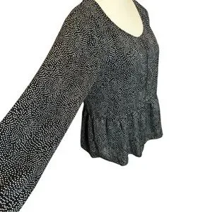 This elegant black with white polka dots blouse from MINKPINK features a flattering peplum design that adds a touch of femininity to its silhouette. The long sleeves and scooped neckline offer a classic look, making it a versatile addition to any wardrobe. Perfect for both casual and formal occasions, this blouse combines style and comfort effortlessly.