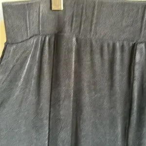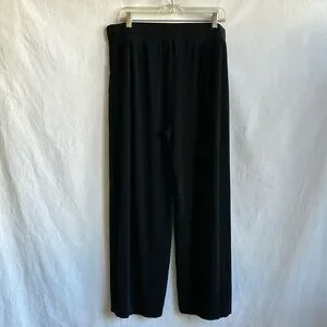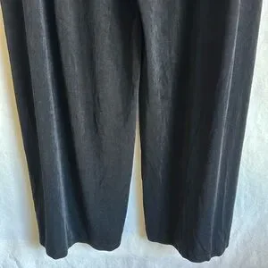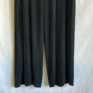 Chico’s Travelers black high rise wide leg stretchy pants, size 3 (16 elsewhere). Good preowned condition. Acetate-spandex blend. Two front flaps extend the length of both legs for flattering visual interest and added heft. First photo is closest to true color (deep black). Perfect for work, leisure, travel!