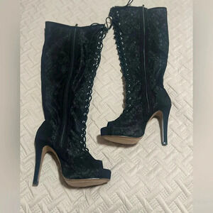 New-TORRID Black Lace Over The Knee Zipper Open Toe Boots.