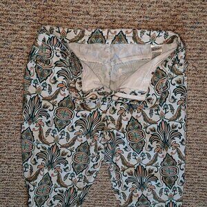 Damask pattern of green, peach, and black on white pants.