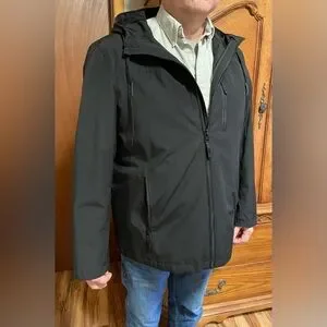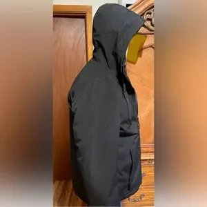 Stay warm and stylish with this sleek black hooded jacket. Perfect for any occasion.