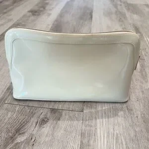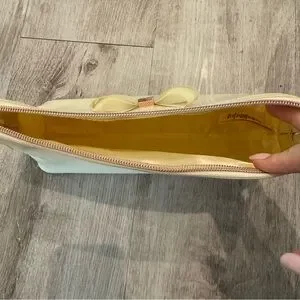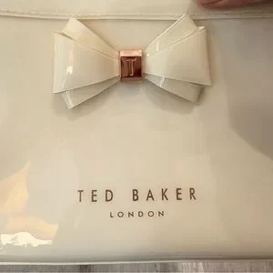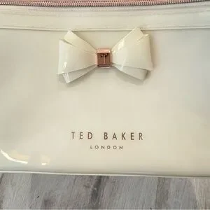 Ted Baker cream colored cosmetic bag with bow logo detail.