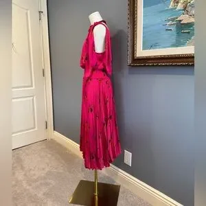 Banana Republic, Size Med Blouse, Small Skirt (stretchy skirt and it ran bigger so I got the Small), beautiful Jot Pink with Orange/Navy floral design. Looks great with Navy heels or flats. Show with Navy slingbacks (not included).