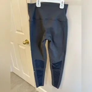 Sleek gray, full length leggings. Textured panel design. High-waisted fit. Perfect for yoga or casual wear.