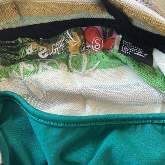 Bring a pop of color to your wardrobe with this beautiful Desigual multicolor summer dress. The dress features a mix of pink, green, grey, white, and black stripes, making it perfect for any boho or bohemian-inspired look. The white straps and plunging neckline add a touch of elegance to this playful dress. The dress is lined with a stretchy fabric, making it comfortable for all-day wear, whether you're exploring new destinations or just running errands. It’s a midi dress depending of your height, review length below. This dress is a size small and is perfect for travel, making it a must-have for your summer wardrobe.