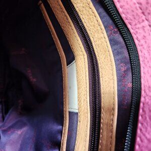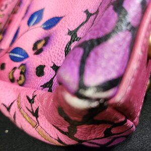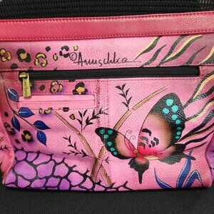 Anuschka Bufferfly satchel bag. Front pocket with turn lock. Back zip pocket and slip pocket . Inside zip pocket and 2 slip pockets. Shows some wear on the bottom corners as show in pics.