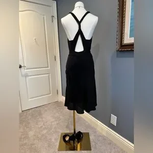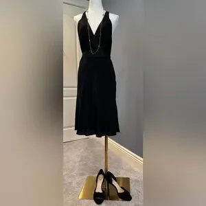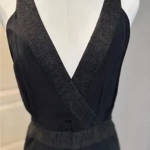 This will become your favorite little black dress. Elegant enough to wear with 4 inch heels or sporty and comfy enough to wear with a cute pair of sneaks and fedora. (Jewelry and shoes and hat not included). Soft matte black silk with a super cute dark gray jersey trim. Twist back. Side zipper. Hits above knee. Size 4 US. Size 40 Italian