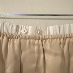 Mid-rise shorts with elastic poplin waistband. Front button detail.