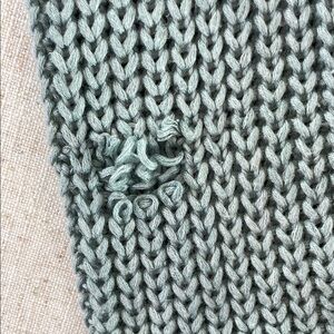 Repair needed: Knit is unraveling on the left arm in one spot. Needs to be darned. Please see pictures. Also in the lower left side on the back there is a very small imperfection in the cable knit.